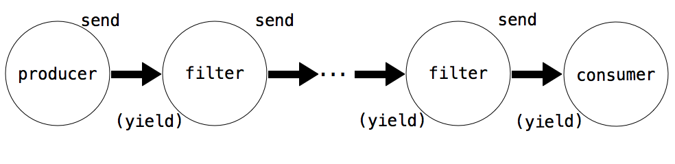 上面的read函數是一個生產者的例子。它不使用(yield),但是使用send來生產數據。函數match是個消費者的例子。它不使用send發送任何東西,但是使用(yield)來消耗數據。我們可以將match拆分為過濾器和消費者。過濾器是一個協程,只發送與它的模式相匹配的字符串。