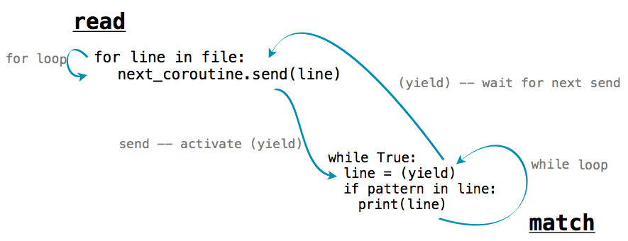 read函數向協程matcher發送每個單詞,協程打印出任何匹配pattern的輸入。在matcher協程中,s = (yield)一行等待每個發送進來的單詞,並且在執行到這一行之後將控制流交還給read。